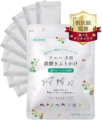 獣医師監修のチキンとかつお味の歯磨きふりかけです。ごはんにかけるだけで、リベチン含有卵黄粉末やKT-11乳酸桿菌、なた豆エキスなどの自然由来成分が歯垢や口臭に働きかけます。国内の無添加・ISO22000認証工場で製造され、生後3ヶ月からシニア犬まで使えます。
