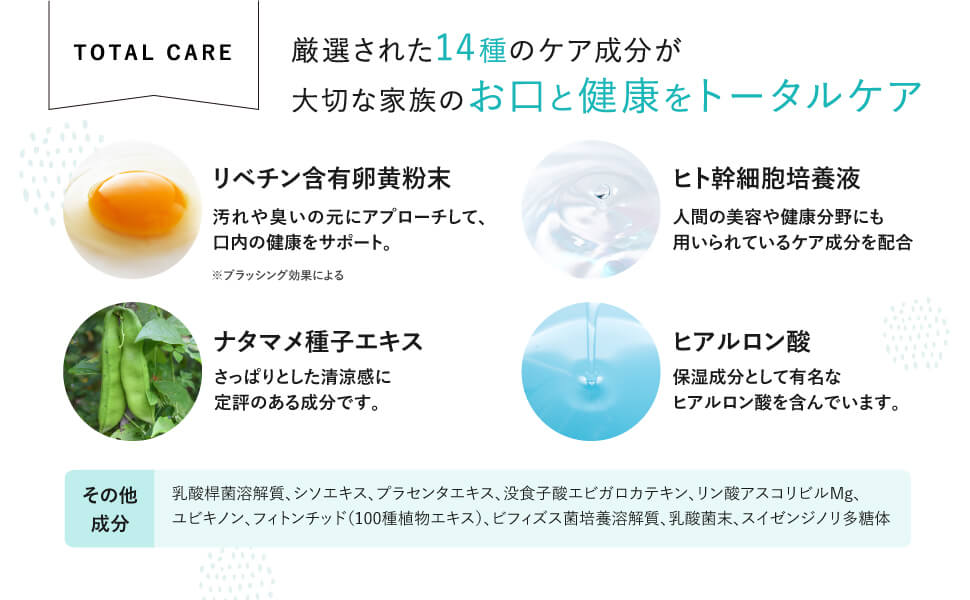 | フィトンチッド(100種植物エキス) | 細菌繁殖抑制、口臭・歯周病予防 |